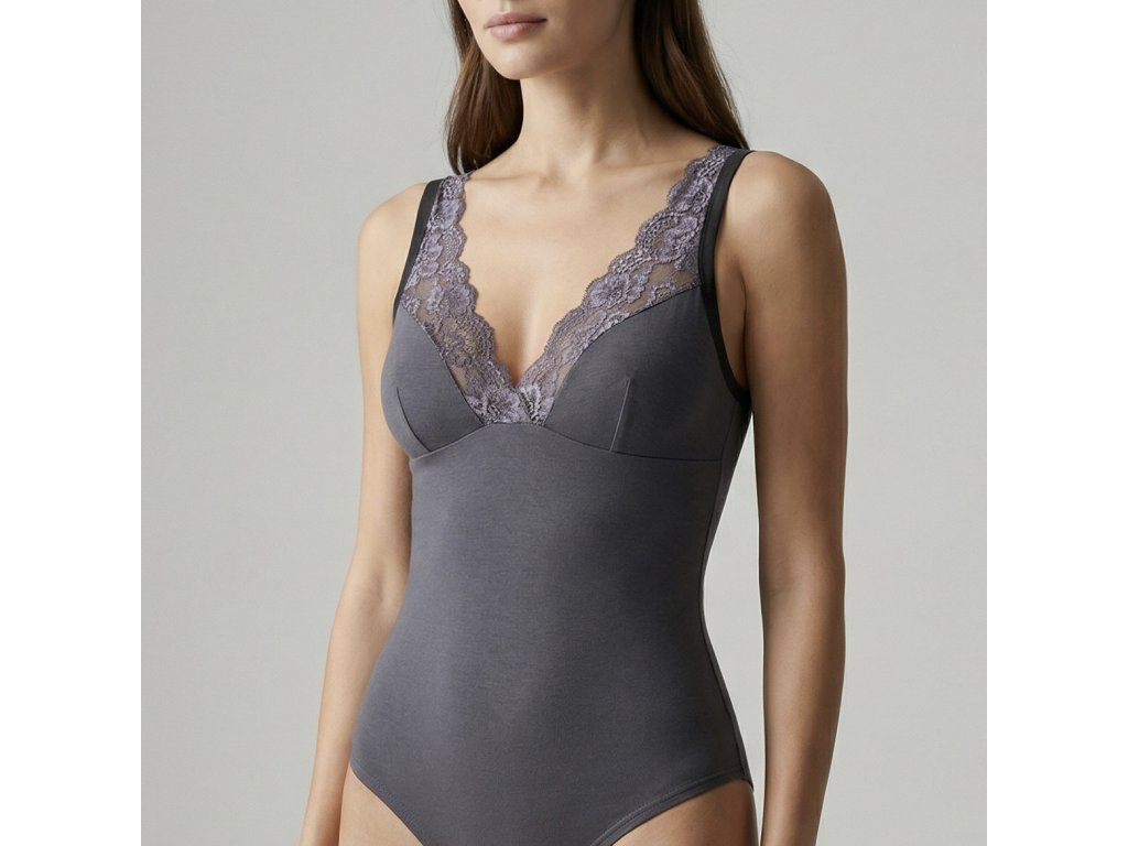 Elegantní šedé body s jemným krajkovým výstřihem. Minimalistický a nadčasový kousek pro každodenní pohodlí i vrstvení.