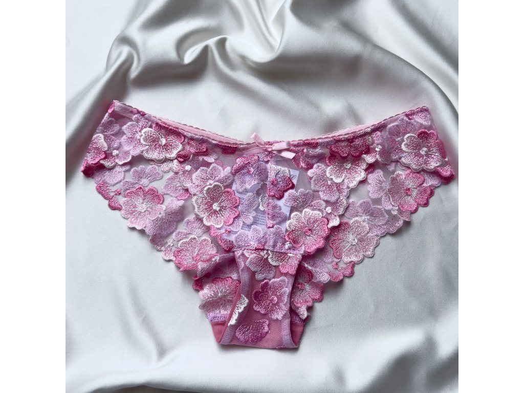Jemné krajkové brazilky s romantickým květinovým vzorem. Krajka není elastická, díky čemuž si zachovává pevnější strukturu a krásně drží tvar.