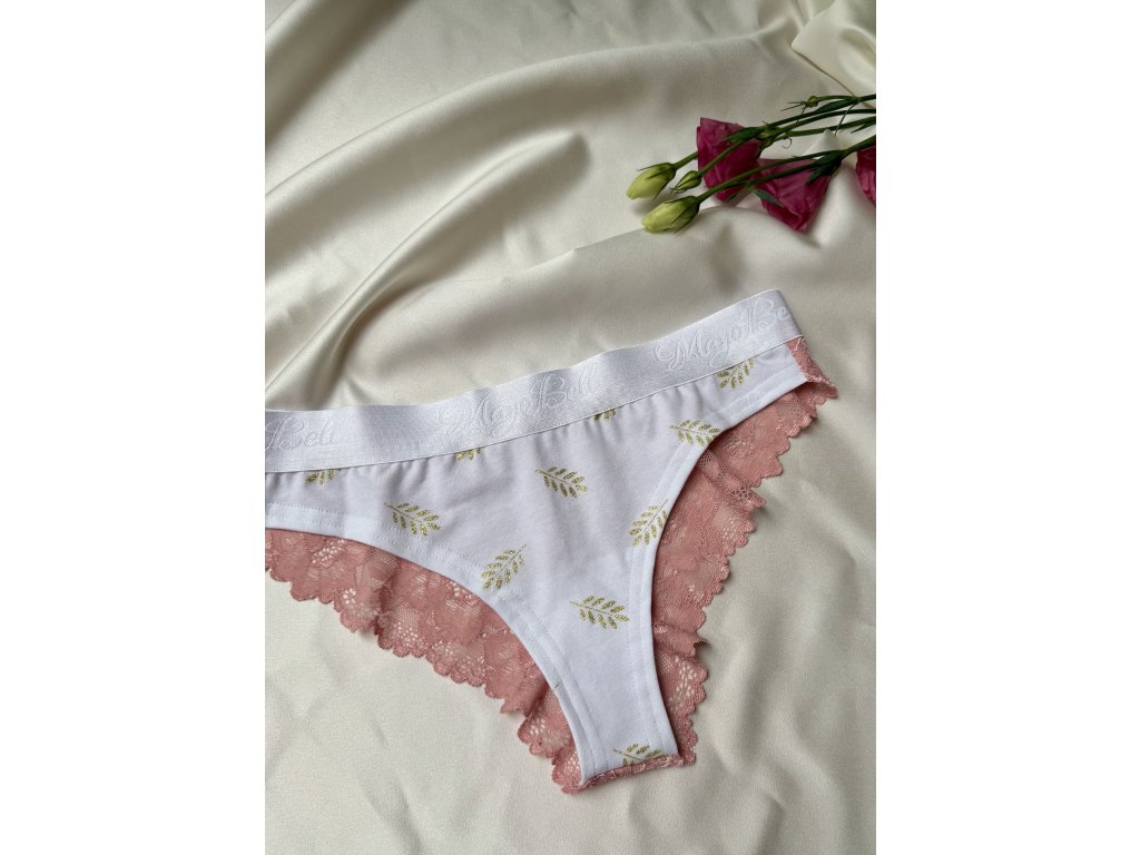 Neodolatelně něžné. Kalhotky s lístečkovým potiskem, krajkou v růžovo-broskvovém tónu a pasem s logem MayoBell – poslední kus skladem.