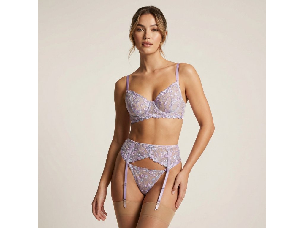 Romantický krajkový set tvořený braletkou s kosticí (bez výztuže a bez podšívky), tangy s nastavitelnými pásky na bocích a podvazkovým pásem se zapínáním vzadu. Elegantní komplet, který zvýrazní siluetu a přitom zůstává lehký a ženský.