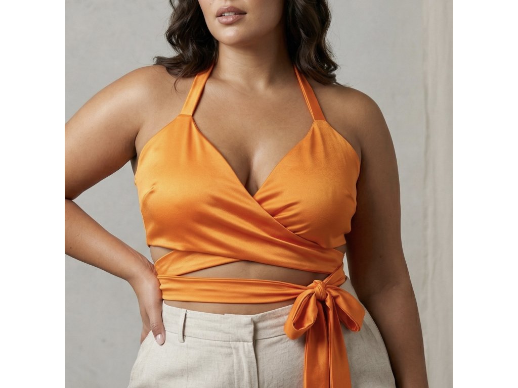 Zavinovací plavkový vršek Aurora v výrazném oranžovém odstínu. Navržený pro větší prsa – velikost M, košíček D.